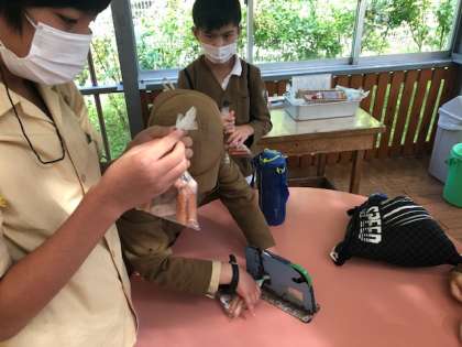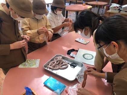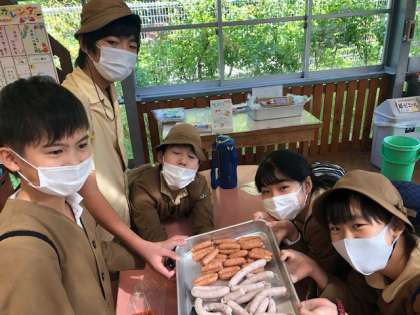 できあがったウインナーをボイルしてもらい、班のメンバーで分けました。それぞれのお家へのおみやげになります。