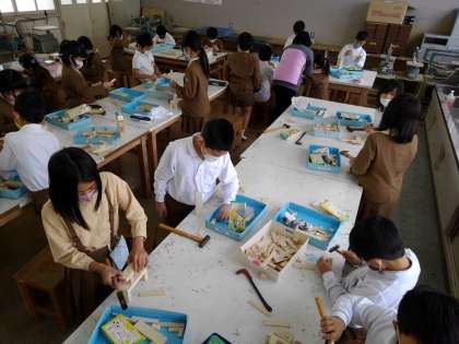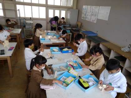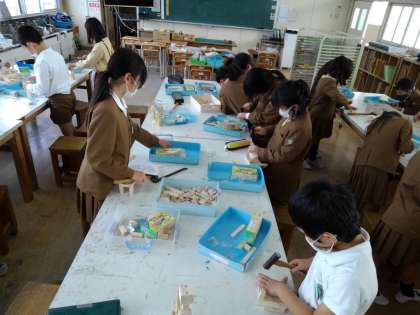 図工科で、「くぎ打ちトントン」をしました。初めはおっかなびっくりで金づちを使っていましたが、すぐに慣れてガンガントントン。接続だけでなく、模様になるように波型やハート形にくぎを打って楽しんでいました。