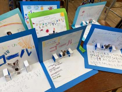 今回も学校開放デーに引き続き、運動会の招待状を作りました。写真だけでなく、ゴールテープも飛び出すしかけがあり、前回よりもパワーアップしています!運動会を頑張りたいという思いを添えて手紙を渡しますので、受け取ってあげてください。
