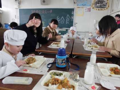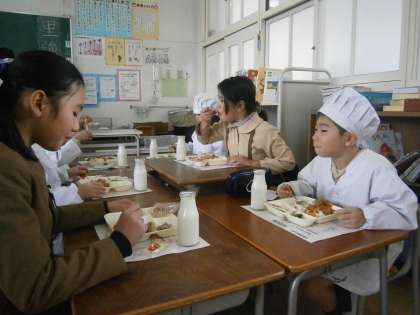 先週の給食週間の一環として、今日はふれあい給食がありました。「他学年と食事を共にすることにより、みんなで楽しい給食ができるようにする」というねらいです。違う学年の児童や日頃お世話になっている先生方と給食を食べることで、さらに交流を深めることができました。