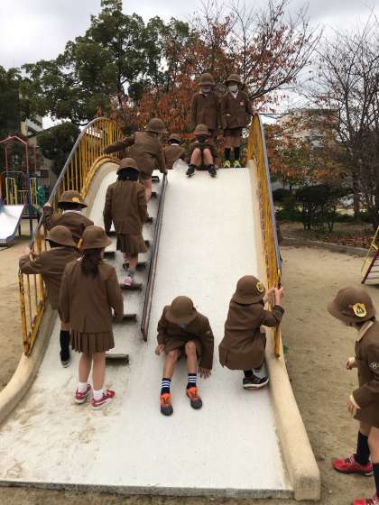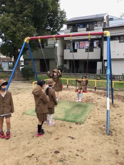 秋みつけの後は、みんなで遊びました。広い公園で、鬼ごっこをしたり、すべり台やブランコをしたりしました。みんなと公園で遊ぶ貴重な時間を楽しく過ごしていました。みんなが使う公園は、大切にしようと話をしていました。