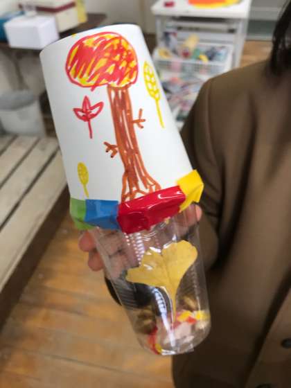 公園たんけんで見つけた、どんぐりでマラカスを作りました。みんな作るのに夢中でとても真剣でした。完成して振ってみると、とてもいい音でした。子ども達は、どんぐりマラカスに耳をあてて、嬉しそうにしてました。お気に入りの曲にあわせて演奏していました。