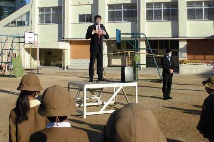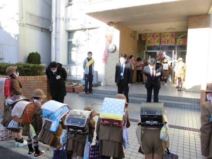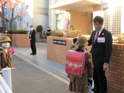 本日、朝早くから此花区 高橋区長と齋藤副区長が来校され、四貫島小学校の子どもたちの登校の様子をご覧になられました。
