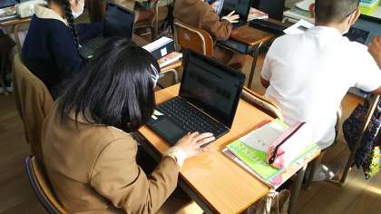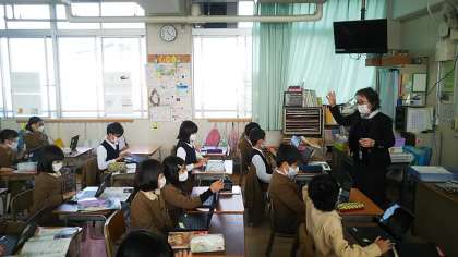 教室に一人1台のタブレットが入りましたので、ログインしてみました。初めてのID、パスワードに戸惑う子もいましたが、ICT支援員の山本先生にも教えていただき、無事社会科の教科書に出てくるものを調べることができました。