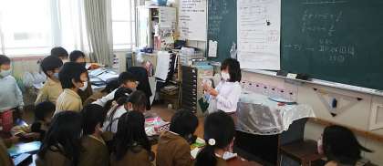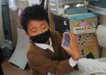 3年生は係活動をがんばっています!今日はマジック係が、みんなを楽しませる手品を披露してくれました。トランプが輪ゴムをすり抜けたり、一瞬のうちに絵が変わったりすると、おー!という歓声と拍手がわきました。