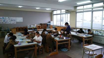 マンガ・イラスト:「作品作り」を熱心に取り組んでいました。図工室前には作品が並んでいて、作品展のようです。