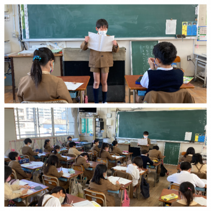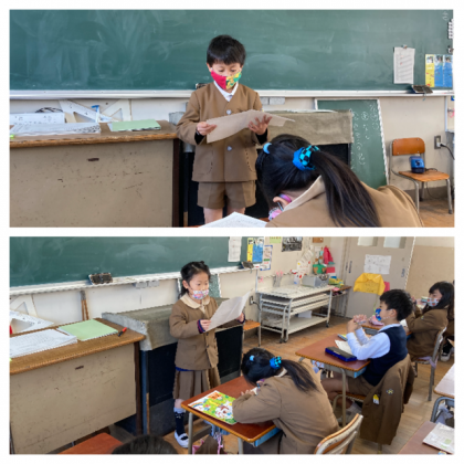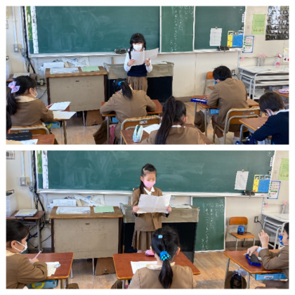 国語科「たからものをしょうかいしよう」では、はじめ・中・おわりの文章構成を学習しました。今日は、自分の宝物について書かれた文章の発表会をしまいした。みんなの前での発表なので、緊張していましたが、声の大きさや間の取り方を意識して、上手に発表することができました。