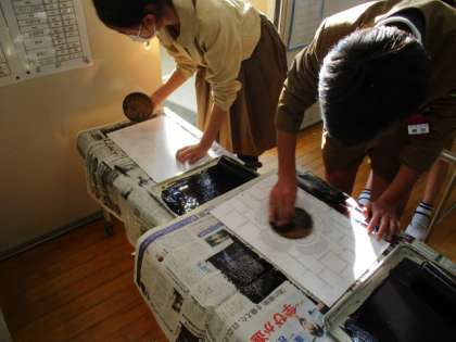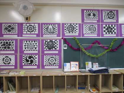 彫刻刀で、戦国武将の家紋と、和風の柄を掘りました。