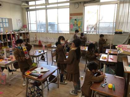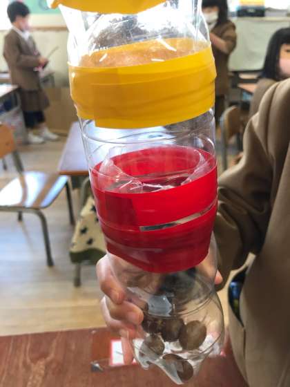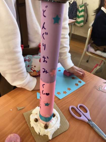 まつぼっくりやどんぐりを使って、おもちゃ作りをしました。楽しいおもちゃ、こわれないおもちゃをめあてに作りました。いろんなところに工夫があって、子どもたちも集中してました。