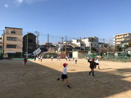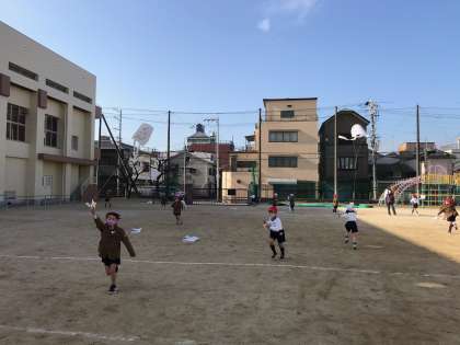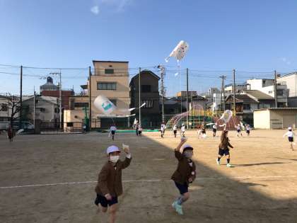 今日も凧あげをしました。昨日より天気がよかったのですが、風は少し弱かったので、子どもたちは運動場を走り回っていました。作ったたこは持ち帰っていますので、休みの日にお家の人と一緒に広い公園で凧をあげてみてください。