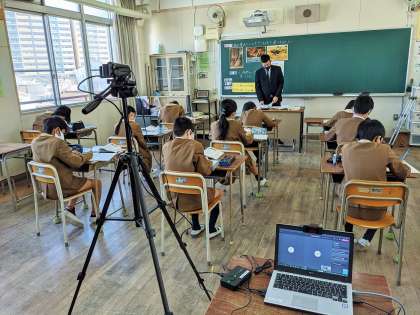「速さ」の単元の研究授業を行いました。ビデオカメラとパソコンを用意し、Teamsで教育センターと繋ぎ、ご指導いただきました。「テレビ局みたい!」と、子どもたちはピリッとした雰囲気で、「単位量あたり」で比べることがわかりました。