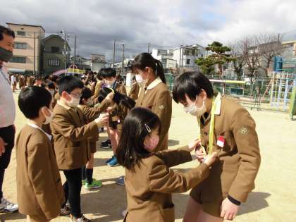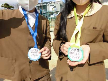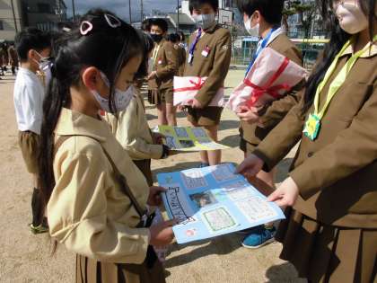 「卒業お祝い集会」では、3年生4年生が作った感謝のペンダントは、1年生が代表で渡しました。また、1年生から5年生の児童が書いた感謝メッセージの色紙は、2年生が代表で渡しました。