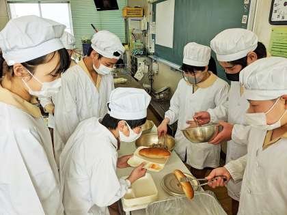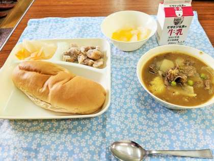 卒業お祝い献立です!給食調理員さんから「おいしく食べてね〜」と食缶を渡してもらいました。いつもの通り協力し合って配膳しました。近江牛のカレーシチューも、フライドチキンもとてもおいしかったです。