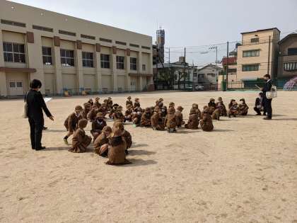 2年生は、運動場でクラス替え。1組!2組!と新しい友だちと出会いました。今年1年の見通しを立てたり、靴箱を確認したりました。