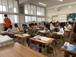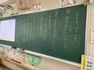 国語科「もしも、どうしたい」の学習では、一つの話題に対して話を上手に長くつなげる活動をしました。話をつなぐためのポイントをしっかりとおさえ、活動することができていました。