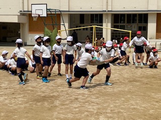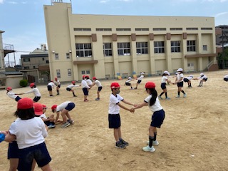 体育科の学習で、「体ほぐしの運動」に取り組みました。みんなで協力する運動、ペアでゆったり行う活動、しっかり動く活動の三つです。運動を通して、クラスみんなの気持ちが一つになってほしいと思います。