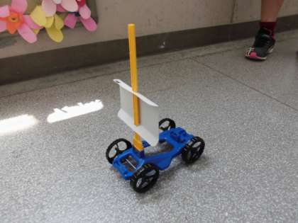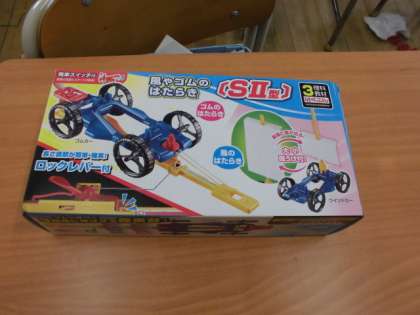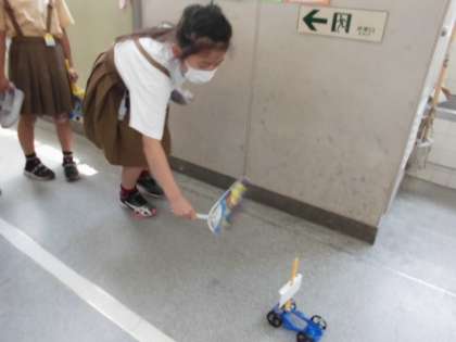 理科の授業で風のちからで走る車を作って、みんなで走らせました。