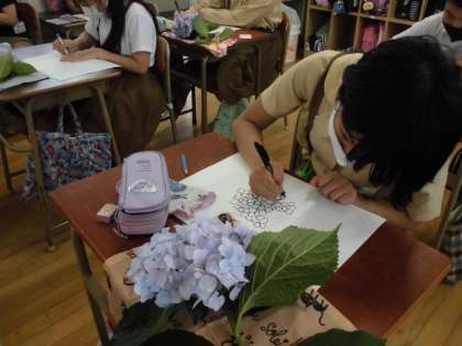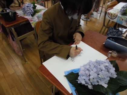 6年生では、図工の時間にそのアジサイの花を描きました。