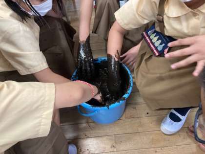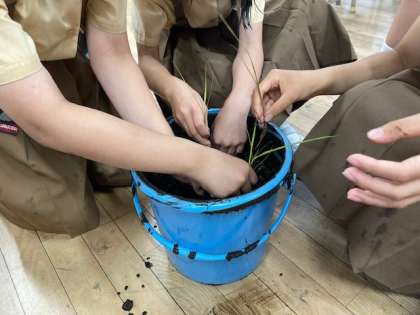 社会科では、日本の米作りについて学習しています。今日は、実際に土づくりをして、稲を植えてみました。何人かの子どもたちが、バケツで稲を育てる方法を調べてきてくれたので、それをみんなで見ながら植えました。無事にお米ができるといいですね!