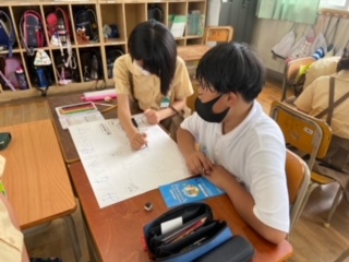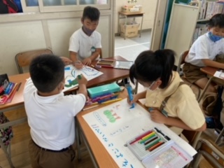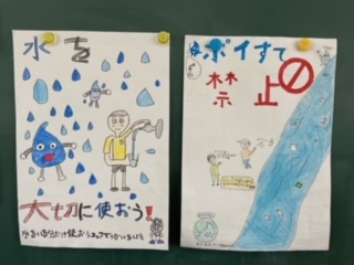社会科で、水道水の学習を進めてきました。最後に、まわりのみんなにも水の大切さを知ってほしいと思い、ポスターを作ることにしました。学校中の手洗い場に掲示する予定です。