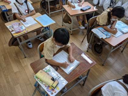 1年生は算数。ひき算プリントの答え合わせをしました。楽勝〜♪とすいすい丸つけできました。