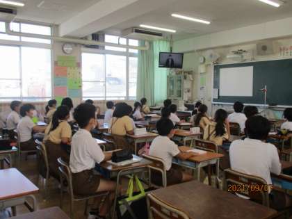 見やすく、聞きやすく、移動の時間も省け、エアコンの効いた教室で密にならず…なかなかいい感じです。みんな集中して校長先生と担当の先生のお話を聞きました。