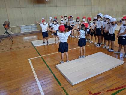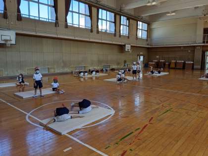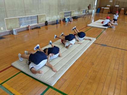 マットでいろいろな運動遊びをしています。今日は「シンクロあそび」。せーの!と合図を掛け合って、転がったり起き上がったりの動きをそろえてみました。