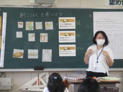 5年生は、朝食が脳とからだとおなかのスイッチになるという働きを確認した後、理想の朝食献立を考えました。また、時間がないときにはパンとヨーグルトと野菜ジュースなど簡単な組み合わせでバランスが良いお手軽朝食になることも教えていただきました。
