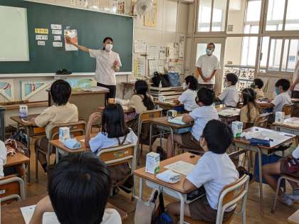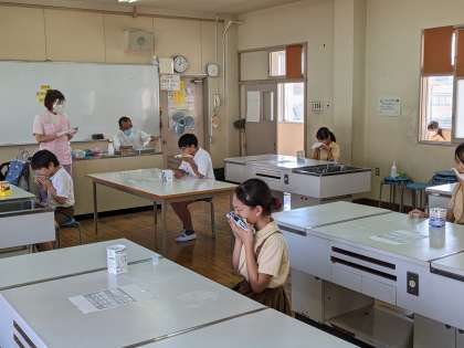 歯科校医先生と、歯科衛生士さんをお招きし、口の中の健康の学習をしました。洋なし味のフッ化物洗口液に「意外とおいしい!」と感想も書いてありました。