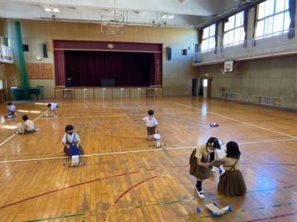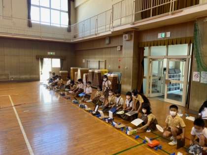 「あおいで動かすのが難しい!」「コツがわかった!」などとヨットカーの走らせ方を考えながら工夫して活動しました。