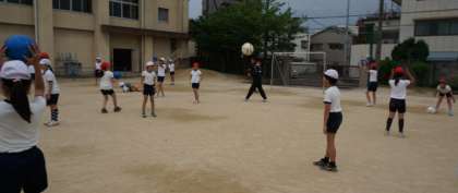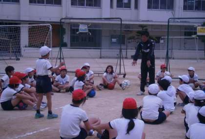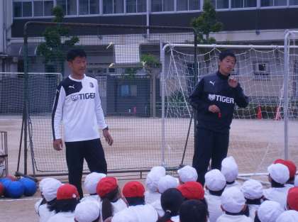 今年もセレッソ大阪から2名のコーチが来ていただきました。四貫島の児童は日頃よりサッカーを楽しんでいて、コーチの見せるサッカー技術に驚きと憧れの眼差しでみていました。前半は運動場で、ウォーミングアップやリフティングの練習をしました。