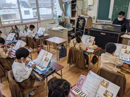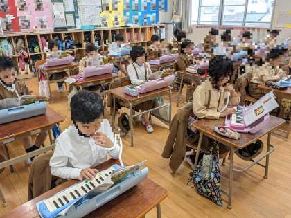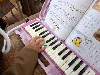 『こぎつね こんこん』の曲で、鍵盤ハーモニカの練習をしました。また、『虫のこえ』の歌も歌いました。