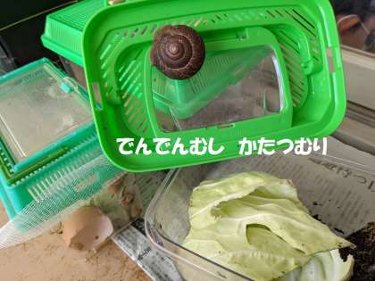 でんでんむしは、1年生のろうかにいます。キャベツの葉とたまごのからを入れてます。もぐもぐ口を動かして食べています。歩いた後は、光っていました。