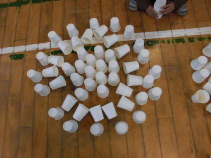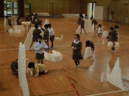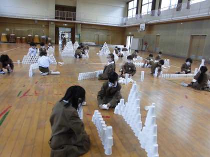 図工科「ならべてならべて」で、紙コップを使っていろいろな並べ方にチャレンジしました。はじめは、一人ひとり活動していたのですが、もっと高く!もっと広く!もっと長く!と、近くの友どちと共同し始め、とても楽しそうに活動していました。