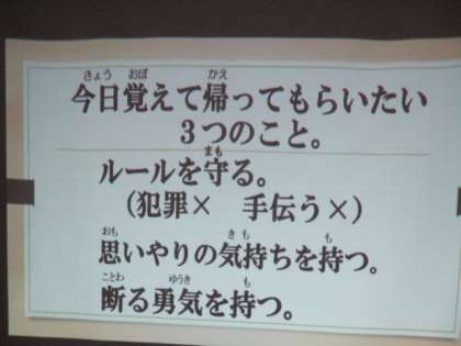万引きは犯罪だし、見張りも共犯であるといった身近なケースを例を挙げてわかりやすくお話しされたので、みんな自分事として真剣に聞き入って学習しました。