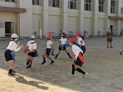 「タグラグビー」に取り組んでいます。試しのゲームをしながら基本的なルールを考えていきました。コートの広さや人数、プレイタイムやファールなど、楽しく試合できるルールを決めていきましょう。