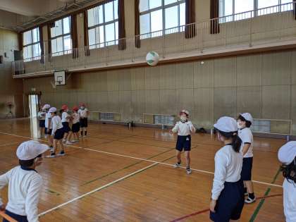 ソフトバレーボールを使って、パスキャッチの練習もしました。アンダーハンドパスにつながるに、ポーンと身長より高く上がったボールを、両手でキャッチしました。