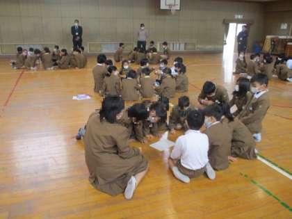今日の児童集会は図書委員会の発表でした。昨日の読み聞かせをした本についてのクイズに、たてわり班で答えます。