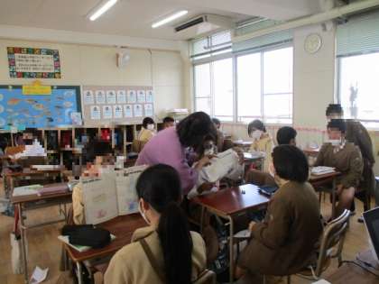 今日の英語の学習では、単元のまとめとして、パンフレットを使って自分の町を紹介する活動をしました。