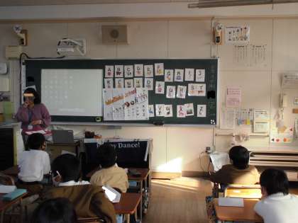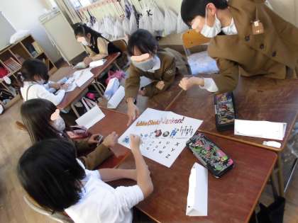 英語の授業がありました。アルファベットを言う練習をしたあと、教室内でアルファベットカードの宝探しをし、大盛り上がりでした。