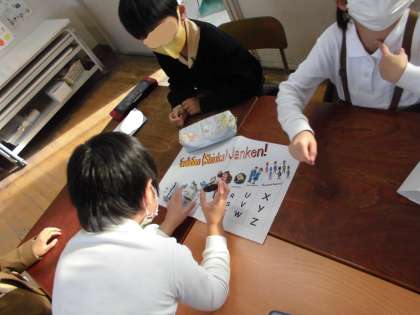 そのあと、進化ゲームをしました。班になってジャンケンをし、勝った人はアルフアベットを言いながら進化していきます。卵からスタートし、生まれたらゴキブリ、トカゲやゴリラなどに進化していきます。最後はスーパーヒーローになれたかな??