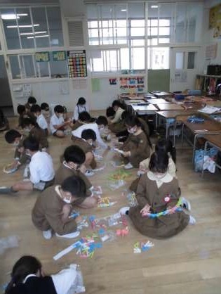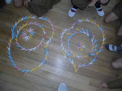 図工「ならべてならべて2」。今回は洗濯ばさみを並べて楽しく制作しました。洗濯ばさみはくっつくので、制作しやすく、いろいろな方向へ形作ることができ、楽しく活動していました。