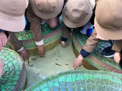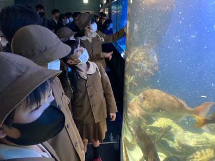 水族館の館内をグループに分かれて回ります。見たい場所を相談しながら、みんなでなかよく見学しています。