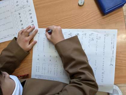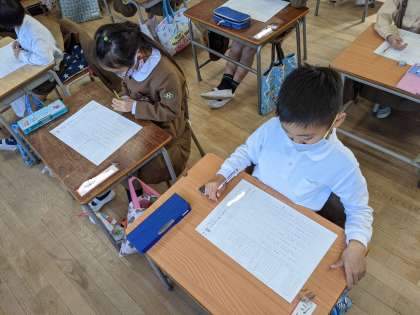 春、ひらがな、かたかなで学習を始めた1年生。今はすべての漢字の学習を終え、昨日は漢字検定に向けて試しのテストをしました。