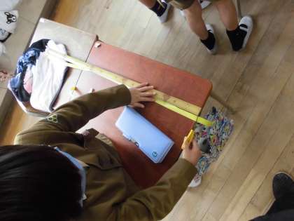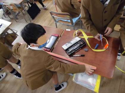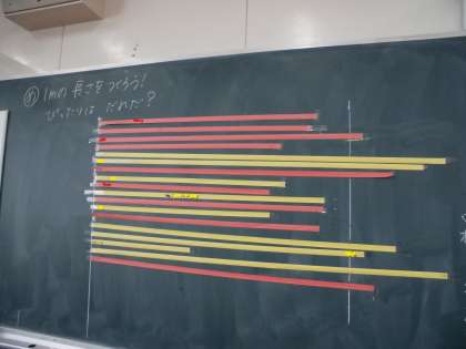 1mがどれくらいの長さかを、一人ずつ紙テープで予想し、クラスでだれが一番近いか比べました。
