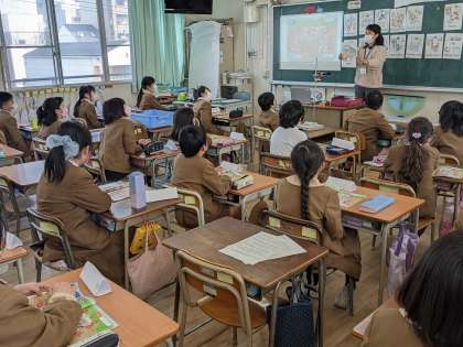 4年生は英語。リザ先生の発音を聞きながら、繰り返し発音をしていました。耳から学ぶ英語です。