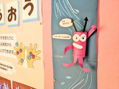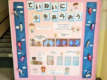 1号階段下の健康委員会の掲示です。手の汚れを実験で確かめ、手を洗おう!という呼びかけがよく伝わります。昼休みには、校内放送でも呼びかけていて、「Wash your hands!」の発音も上手です!