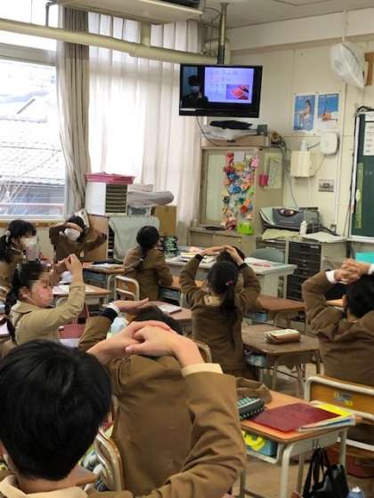今週は給食感謝週間として、テレビ放送児童集会で、給食委員会の発表がありました。給食委員会の児童が、調理員さんにインタビューをした動画を見て、給食に関するクイズをしました。教室では、みんなテレビを食い入るように見て、クイズで盛り上がりました。給食についてとても興味がわく発表でした。