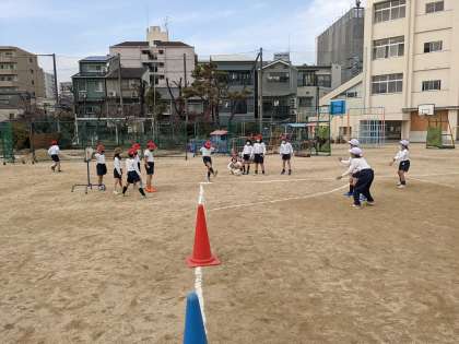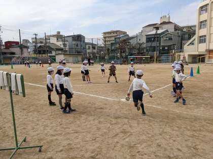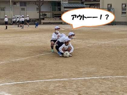 攻撃チームの子が蹴ったボールを直接キャッチするか、ゴロでキャッチしたときは守りのチームが一列になって座ればアウトにできます。蹴った子はアウトになる前にコーンを回ってホームベースに戻れば点が入ります。みんなでルールを考えました。