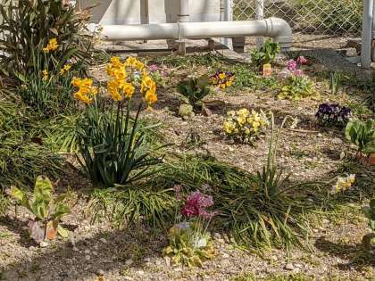 校舎裏の桃の花やすいせんもきれいに咲いています。
